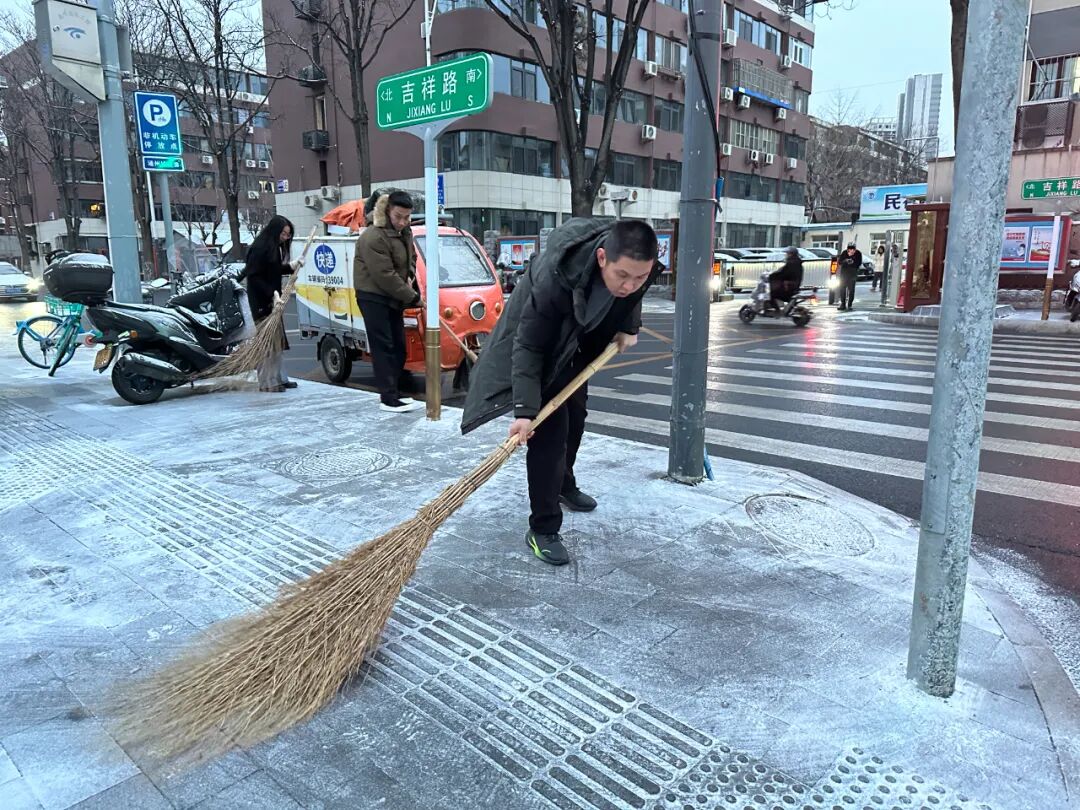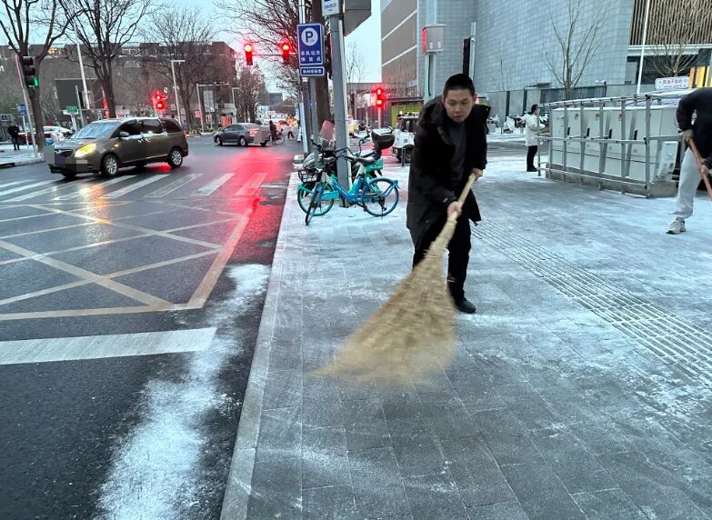 “我是辦公室的”“我是場館中心的”“我是社體中心的”……12名來自通州區體育局各個科室的工作人員,用掃把、雪鏟將雪推至便道兩側,掃出一條寬度約1米的步行通道。李鳳蘋表示,從下雪開始,便安排人員上街進行清掃,每隔2個小時清掃一次。