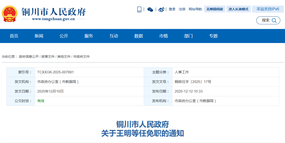 銅川市政府2025年12月10日決定,任命: