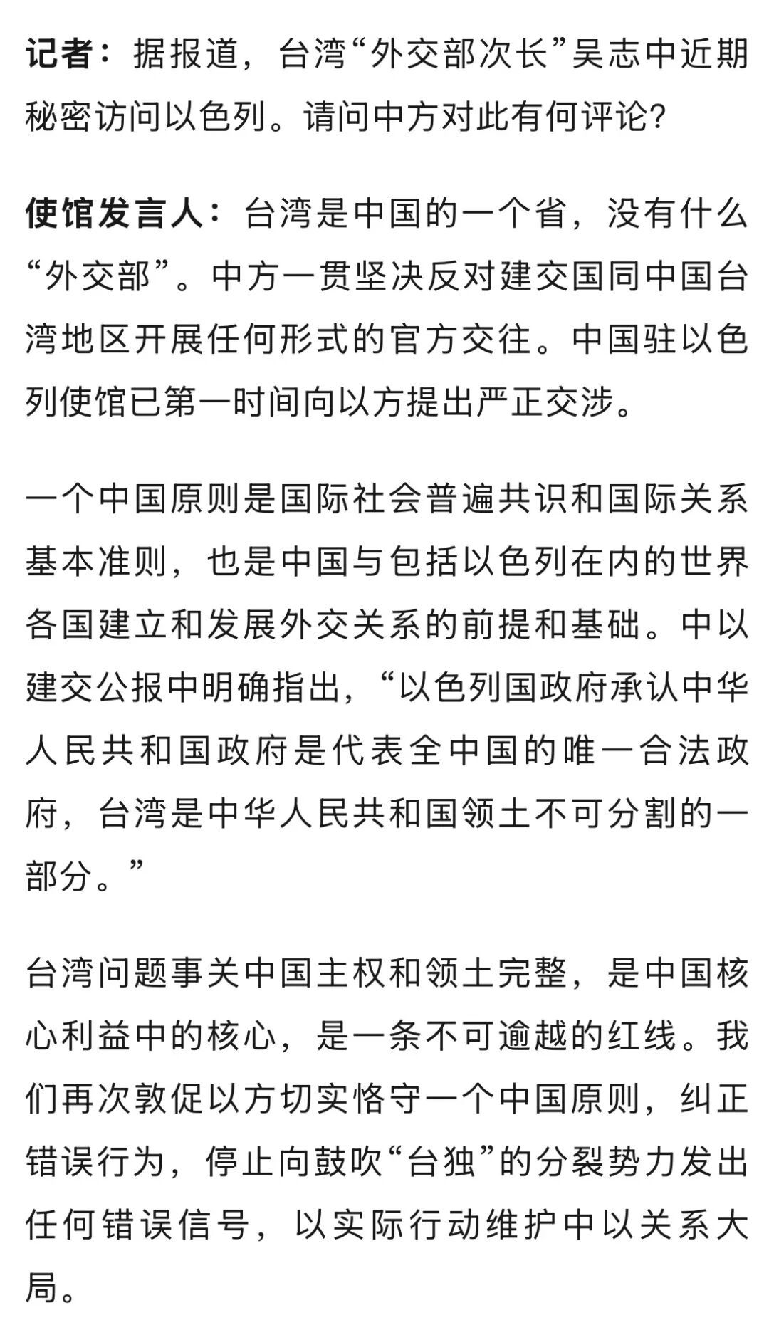 中國駐以色列使館發言人就臺灣當局外事部門官員竄以答記者問。
