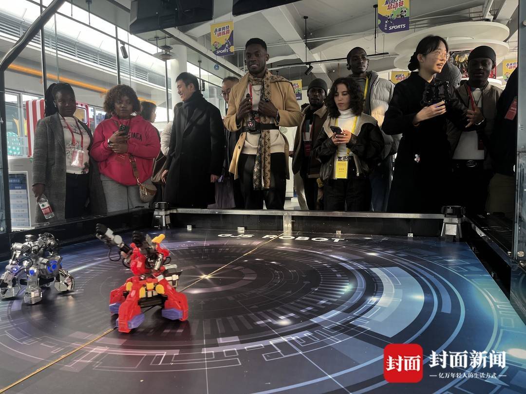 機器人體驗館內(nèi)更是熱鬧非凡。會作揖會跳躍,還會賣萌的機器狗,跟著音樂節(jié)拍扭動身軀跳“廣場舞”的人形機器人,讓留學(xué)生們?nèi)炭〔唤P愿裢庀虻乃麄儑锨叭ィ蛏焓峙c機器狗互動,或跟著機器人的舞步模仿動作,館內(nèi)滿是歡聲笑語。機器人對壘臺前,四川農(nóng)業(yè)大學(xué)加蓬留學(xué)生李安德和伙伴們手持遙控器,操控著機器人展開“PK”,金屬碰撞的清脆聲響與圍觀者的陣陣喝彩聲交織在一起;一旁的糖畫機器人正精準勾勒出卡通圖案,自動咖啡機一鍵出品香醇咖啡,讓女生們頻頻發(fā)出“哇”的贊嘆,指尖不停按下拍照鍵。