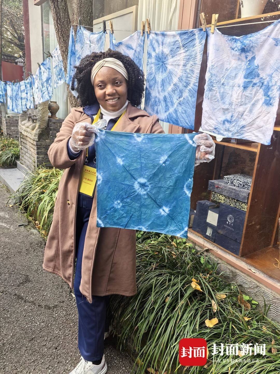 扎染體驗區(qū)早已備好素白棉布、靛藍染缸和各式夾具,工作人員手持紗線示范著“夾纈”技法,用流利的英文細致講解:“先將棉布折疊成喜歡的形狀,用夾子固定緊實,再浸入染缸,留白的部分會形成獨特花紋。”