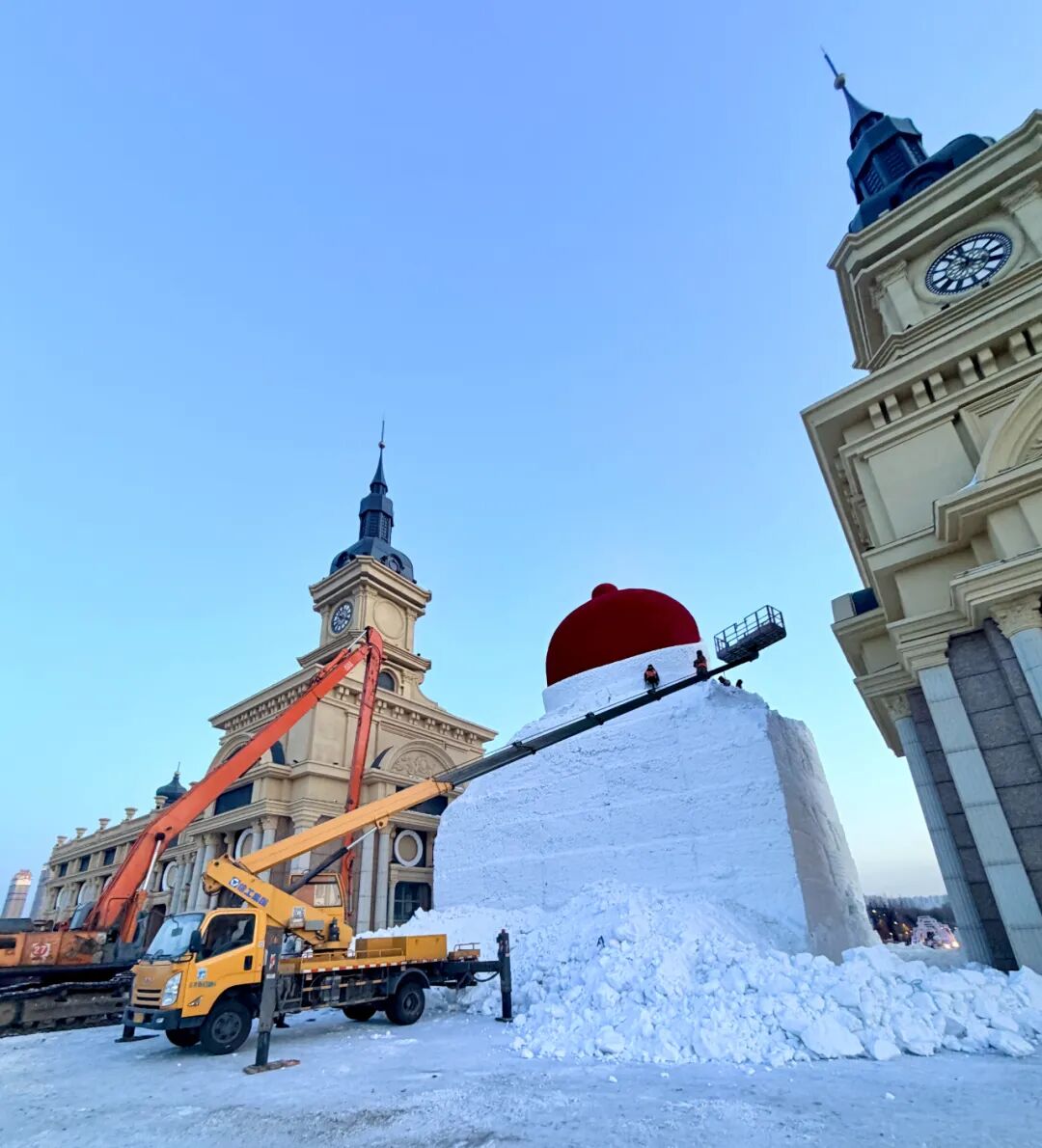 “我們總說堆雪人、堆雪人,所以很多南方朋友一直覺得,大雪人是堆出來的。”2024年末的冬天,張寒霜和設計團隊在為哈爾濱開發文旅特色文創產品過程中,通過線上線下接觸到很多南方游客。她了解到,在大多數人的傳統認知里,“堆雪人”是童年冬季游戲的代名詞。然而,哈爾濱包括音樂長廊在內的大雪人,以及冰雪大世界、雪博會里的很多巨型雪雕,其建造工藝遠非“堆砌”那么簡單。它們是采用高密度人造雪,通過層層夯實、沉降,再由雪雕師傅像雕刻理石一樣,從巨大的雪坯中,“挖掘”與精心雕琢出來的冰雪藝術品。