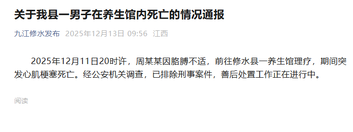 12月13日,“九江修水發(fā)布”發(fā)布“關(guān)于修水縣一男子在養(yǎng)生館內(nèi)死亡的情況通報(bào)”稱: