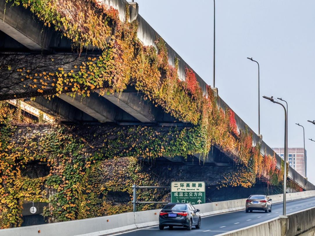 冬日暖陽下,二環高架茂盛的爬山虎已褪去夏日的翠綠,化作一片斑斕的五彩長廊,斜陽拉出工整的光影,為鋼筋水泥注入詩意的生機。橋下,是城市永不間斷的脈搏;橋上,一切仿佛被這金色的琥珀凝住了,成了城市記憶里一個閃光的斷面。這光影就像冬日的成都——在奔騰的節奏里,總為堅硬的城市筋骨,披上一層溫潤、閑適的氣韻。文字/編輯 楊碩攝影 曹勁松制圖 曹勁松 嚴瑾審核 藺虹豆