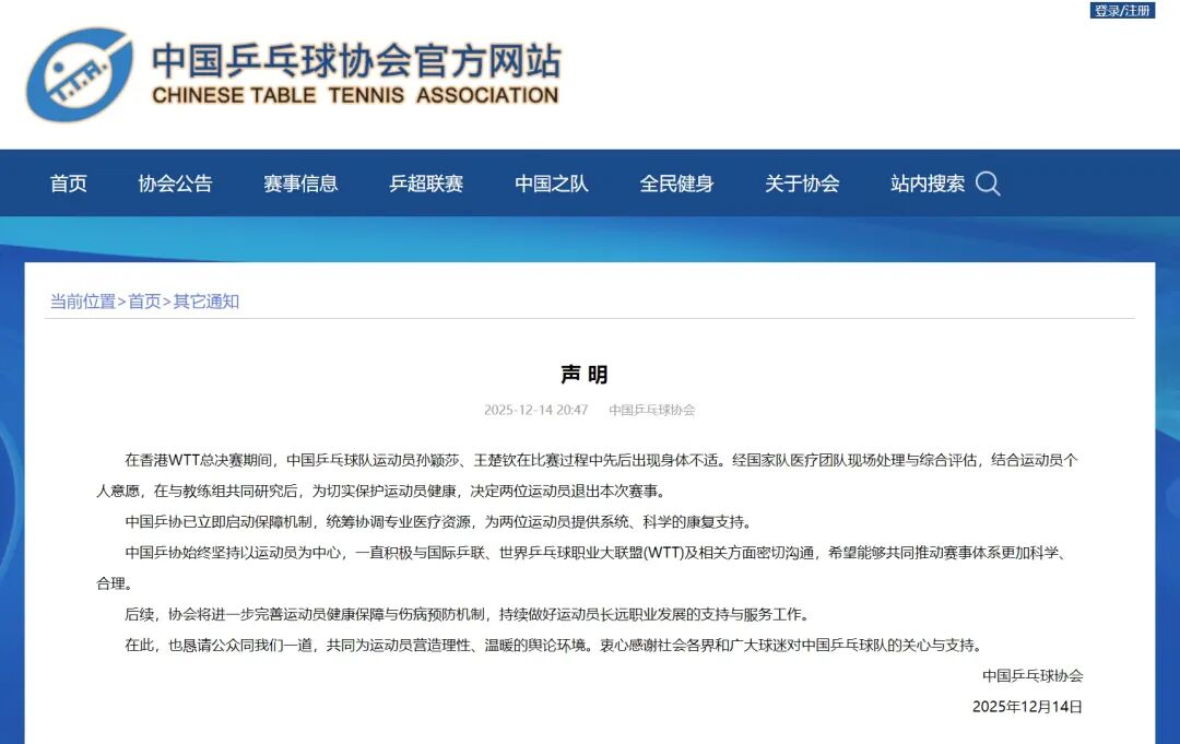 12月14日,中國乒乓球協(xié)會(huì)發(fā)布聲明,回應(yīng)孫穎莎、王楚欽因傷退賽事宜: