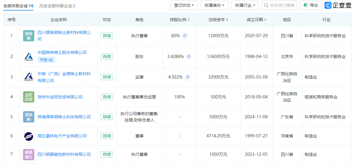 企查查顯示,源萊順再生資源實際控制人為曾陽慶。曾陽慶除掌控源萊順相關企業外,還擔任賀州市金旺投資有限公司執行董事兼總經理、中稀(廣西)金源稀土新材料有限公司監事等職。