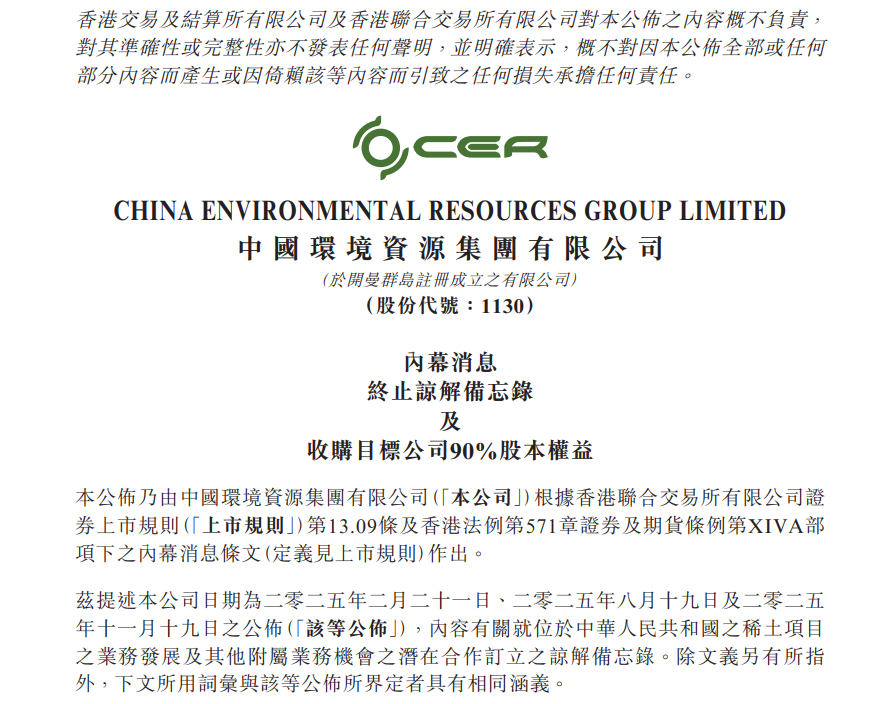 同日,中國環境資源通過全資附屬公司與源萊順稀土新材料訂立股權轉讓協議,有條件同意以人民幣900萬元收購源萊順再生資源90%股本權益。完成后,源萊順再生資源將納入中國環境資源合并報表。