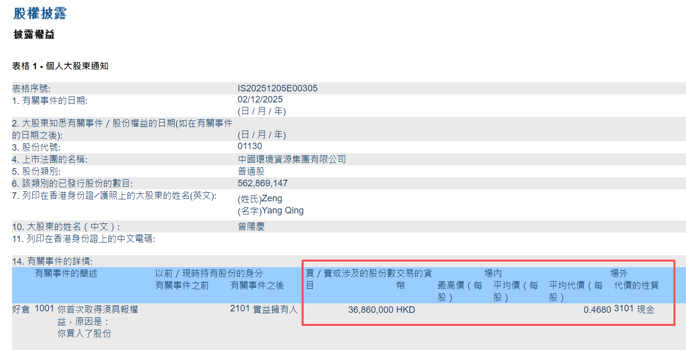 值得關注的是,12月2日,曾陽慶增持中國環境資源3686萬股,每股作價0.468港元,總金額為1725.048萬港元。增持后最新持股數目為3686萬股,最新持股比例為6.55%。