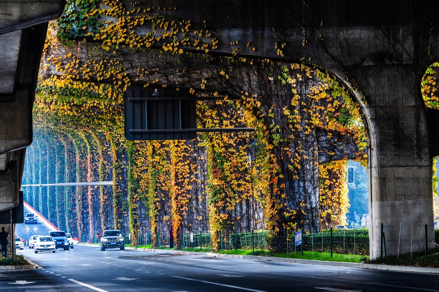 看慣了郁郁蔥蔥的綠色,又可以欣賞色彩斑斕的秋冬裝,成都高架上的爬山虎總是給人驚喜,真是美了美了醉了?