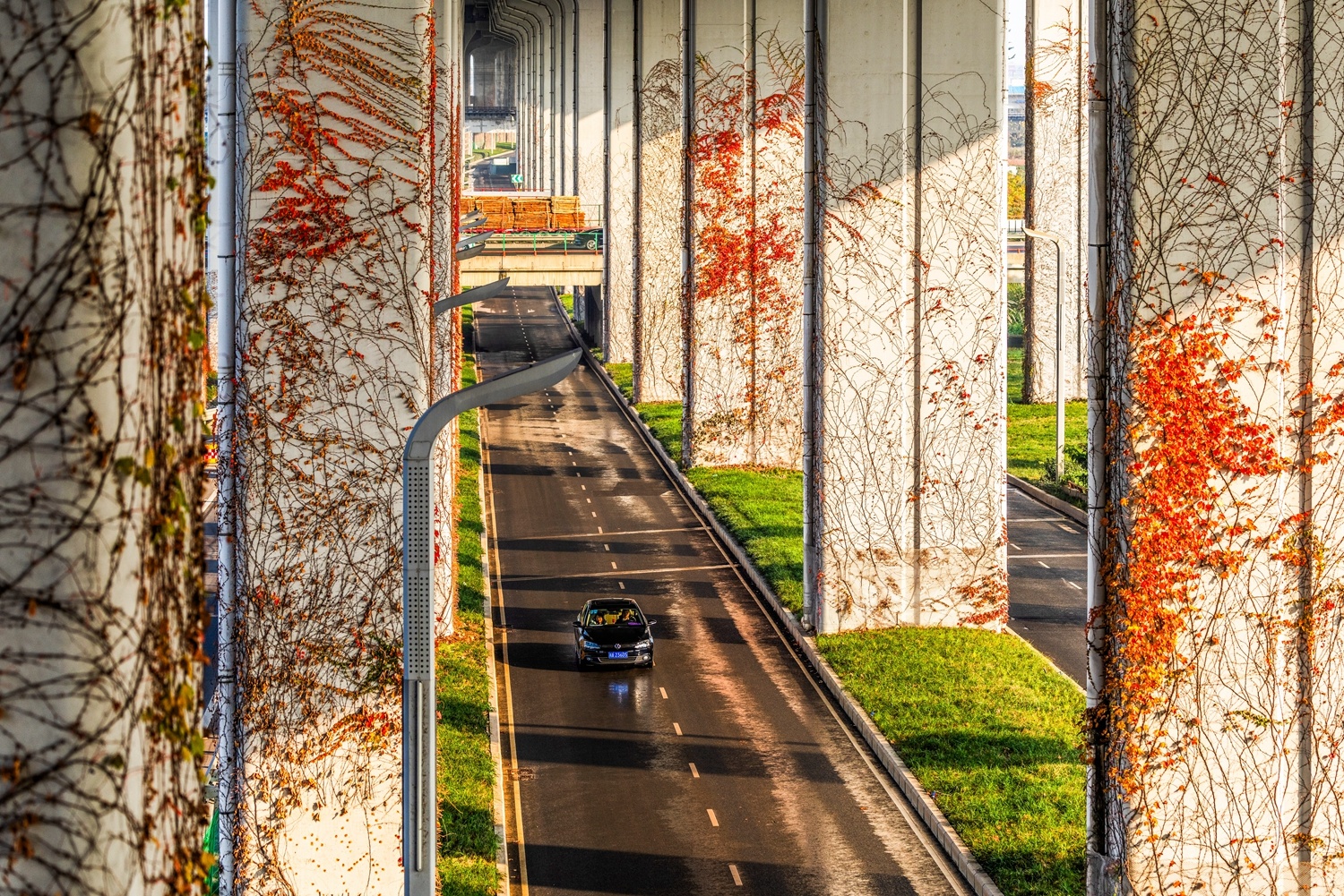 成都市成華區李家沱路段,爬山虎爬滿橋體,鋪就了一片藏在車流旁的冬日浪漫。