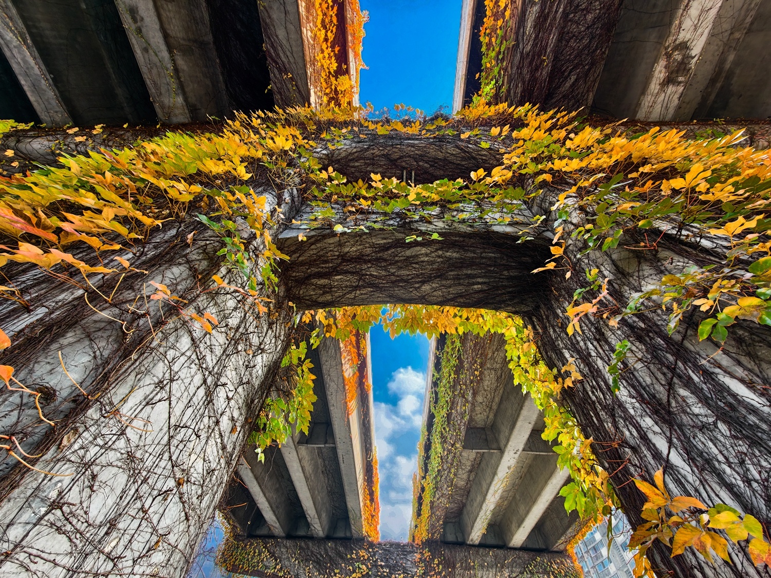 成都市成華區建設路段,爬山虎爬滿橋體,鋪就了一片藏在車流旁的冬日浪漫。