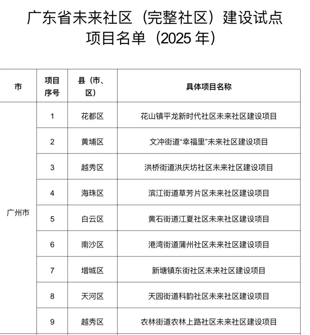 日前,省住房城鄉(xiāng)建設(shè)廳官方網(wǎng)站公布了《廣東省未來社區(qū)(完整社區(qū))建設(shè)試點(diǎn)項(xiàng)目名單(2025年)》,廣州有9個(gè)社區(qū)上榜,數(shù)量位居全省第一。