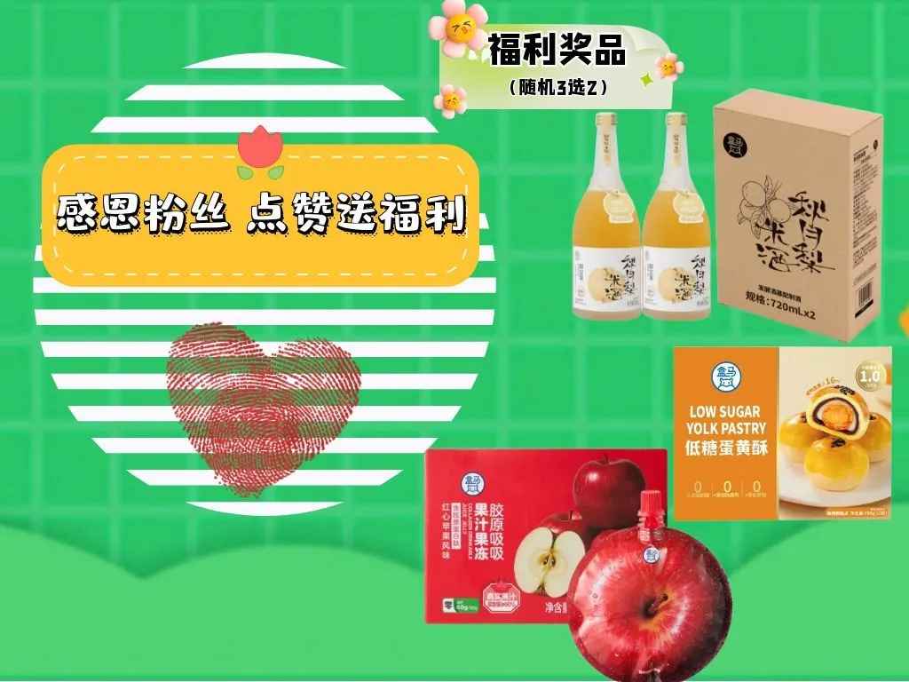 ?獎(jiǎng)品隨機(jī)3選2(秋月梨米酒、低糖蛋黃酥、果凍吸吸蘋果味),逢周一公布名單,免費(fèi)快遞到家。