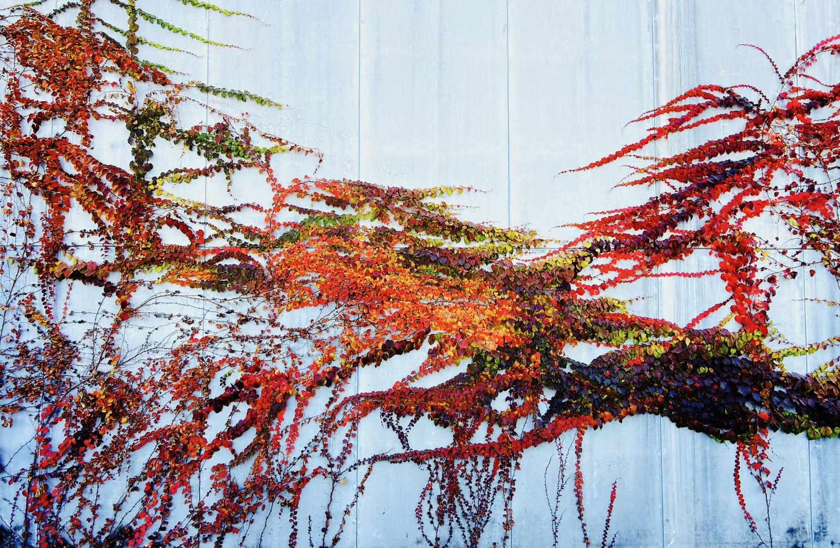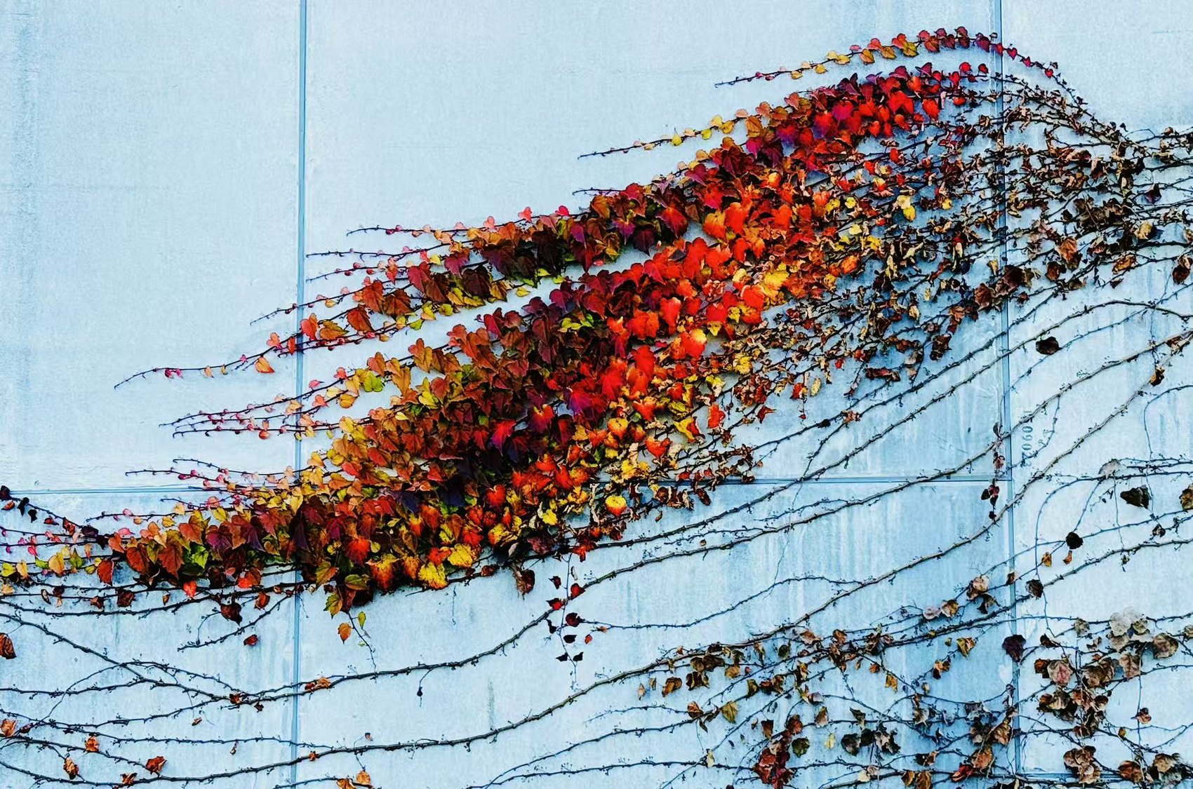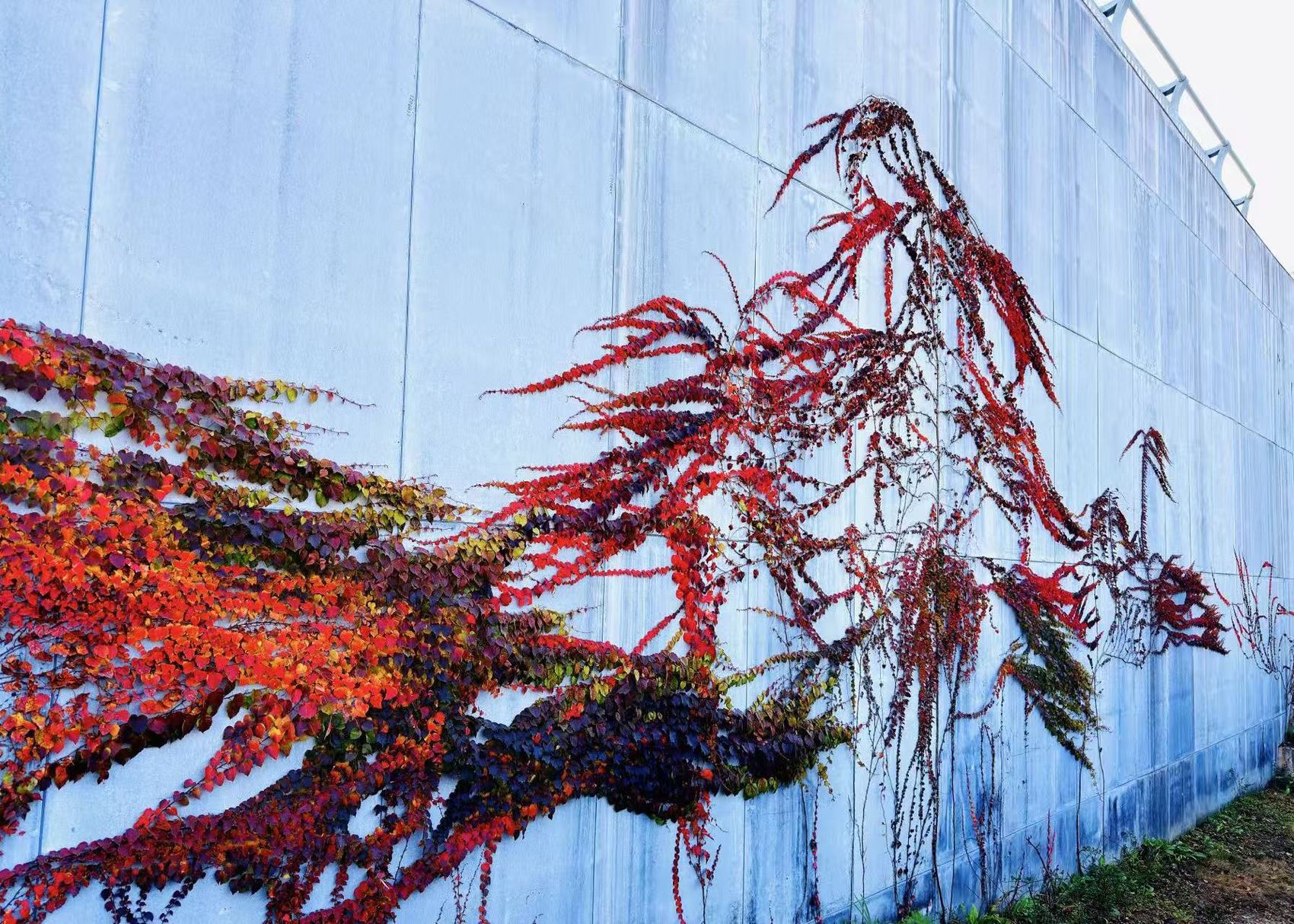 灰白的水泥墻如一張素凈宣紙,爬山虎攜絳紅、深褐的藤蔓作筆,在這方天地間揮毫潑墨,暈染出一幅靈動的自然山水。