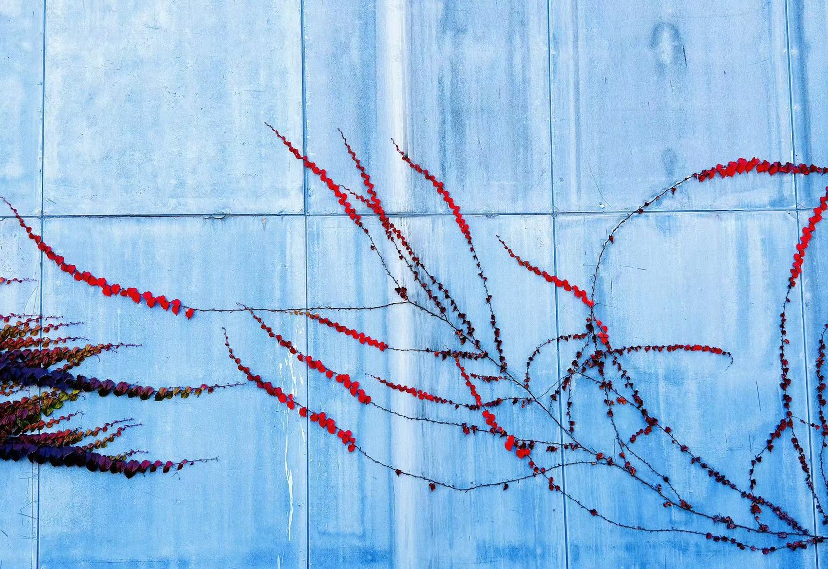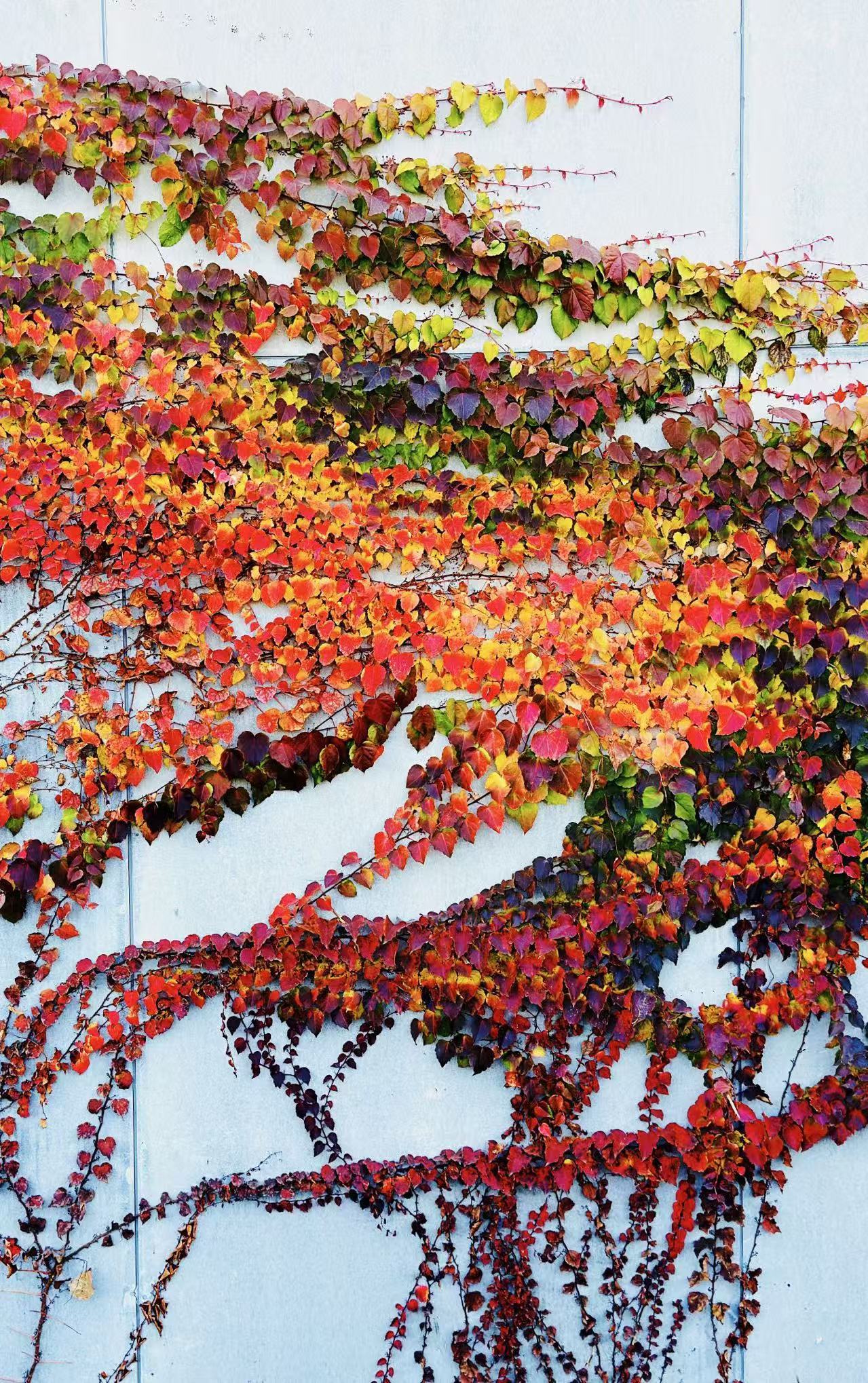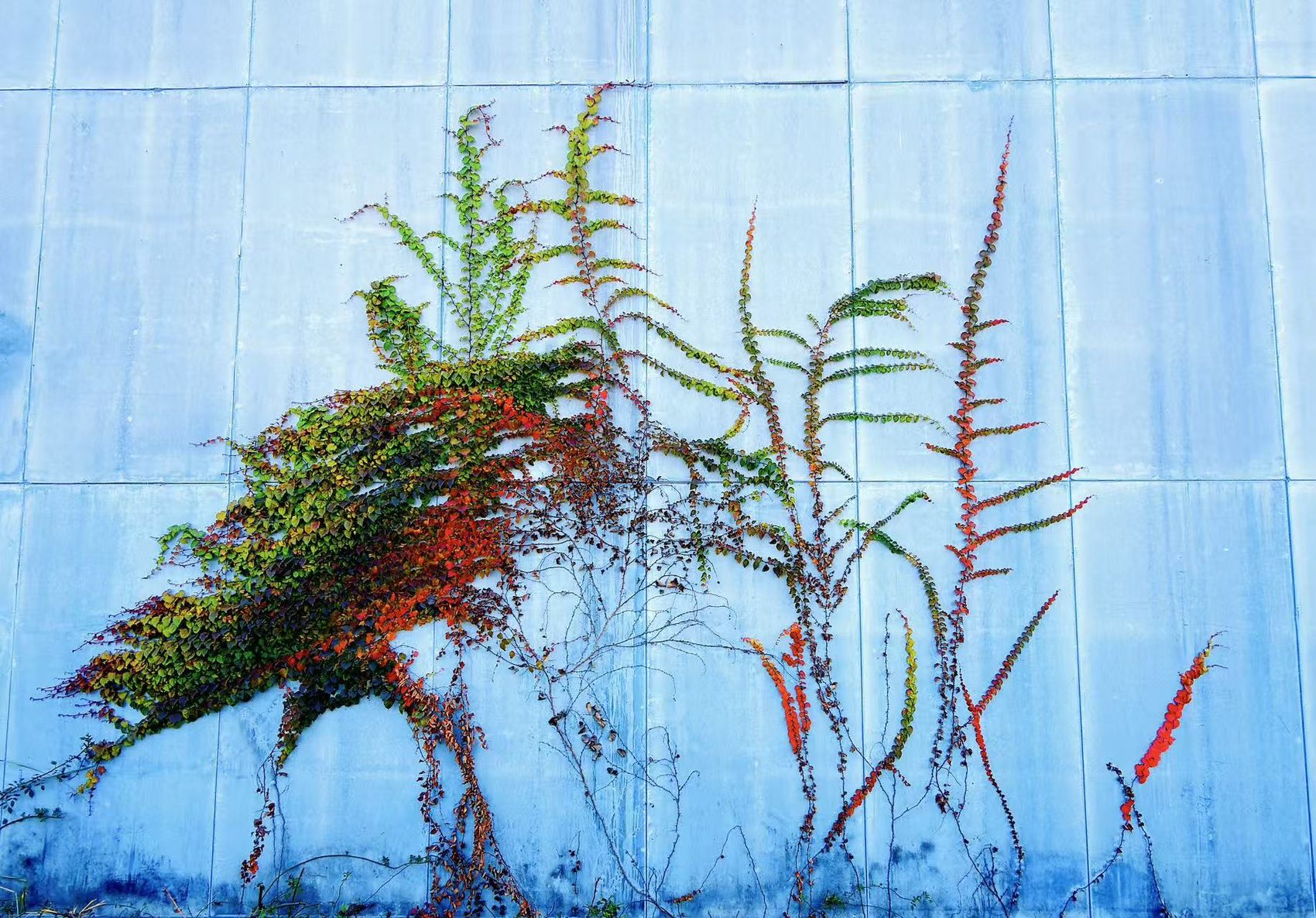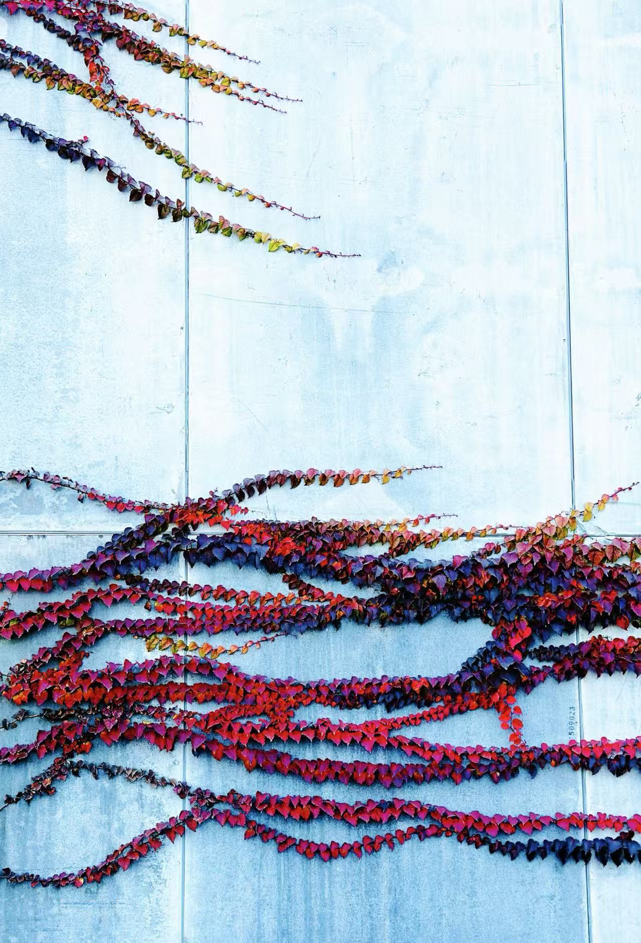灰白的水泥墻如一張素凈宣紙,爬山虎攜絳紅、深褐的藤蔓作筆,在這方天地間揮毫潑墨,暈染出一幅靈動的自然山水。