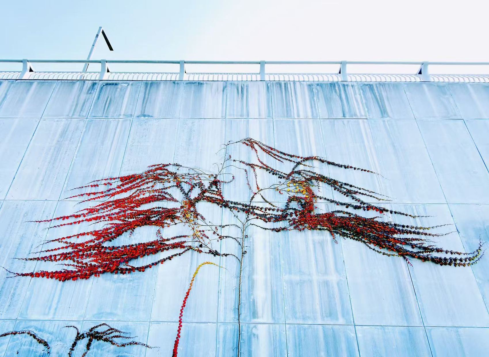 向上攀伸的藤蔓,虬曲的枝椏仿若蒼松的勁骨,遒勁中帶著幾分傲然,細碎的紅葉似松針般簇簇點綴,在冷硬的墻面撐起一片嶙峋的“松影”;蜿蜒垂落的藤條又似山間古木的枝柯,從“山巔”垂墜而下,褐紅的葉串如流蘇般輕晃,將樹木的蒼勁與柔婉揉合得恰到好處。