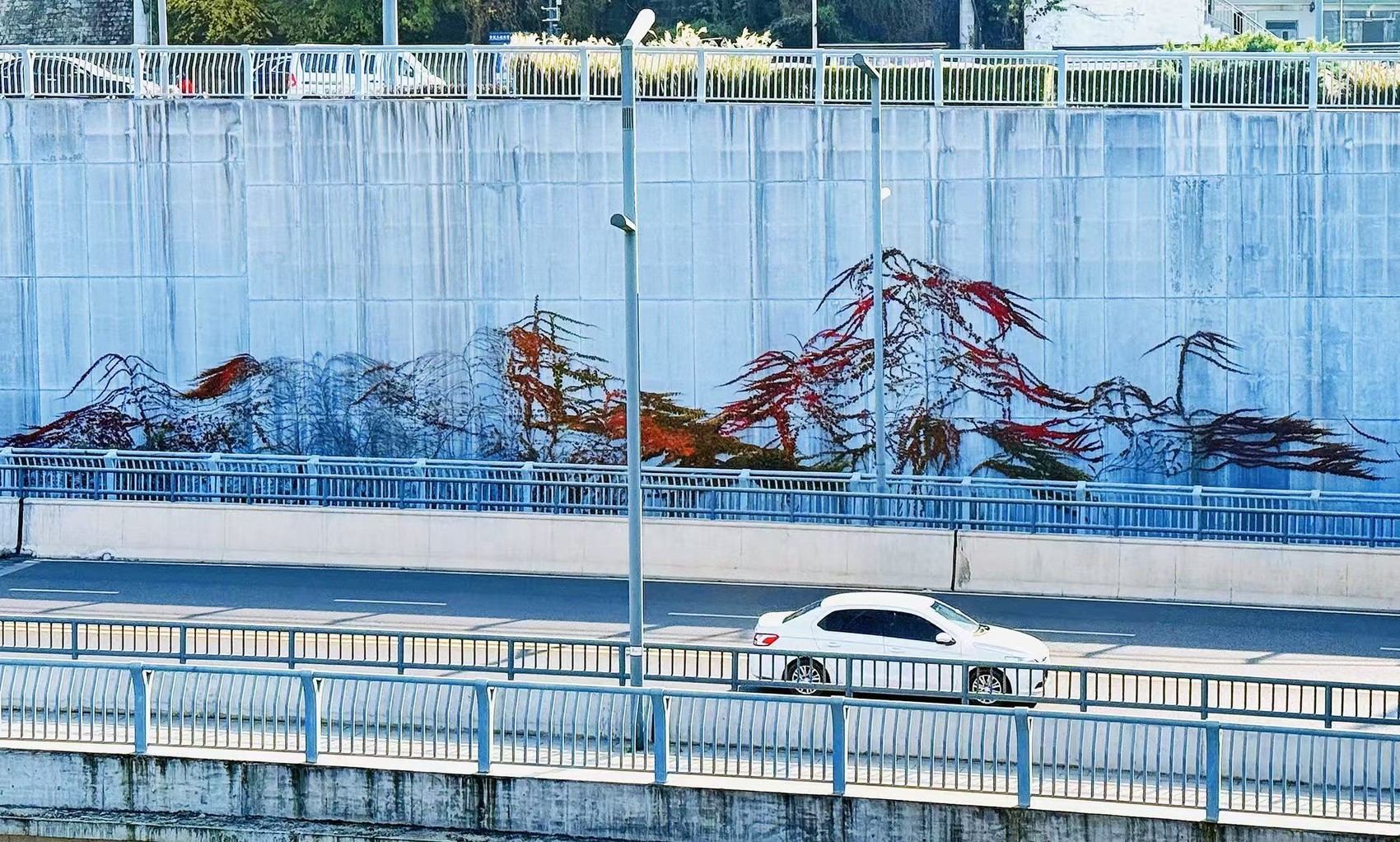整體望去,藤蔓的走勢勾勒出遠山的輪廓,濃淡交錯的紅褐葉片是山巒的肌理,淺淡的枯藤則成了山間的云靄與溪澗,本是攀附建筑的尋常藤蔓,卻在鋼筋水泥的肌理間,勾勒出一幅融水墨韻味與草木活力的冬日秋山景致。微風掠過,枝蔓輕顫,紅葉簌簌,那“山水”便似活了過來,在素墻之上流淌著綿陽這個冬日獨有的清逸與磅礴。