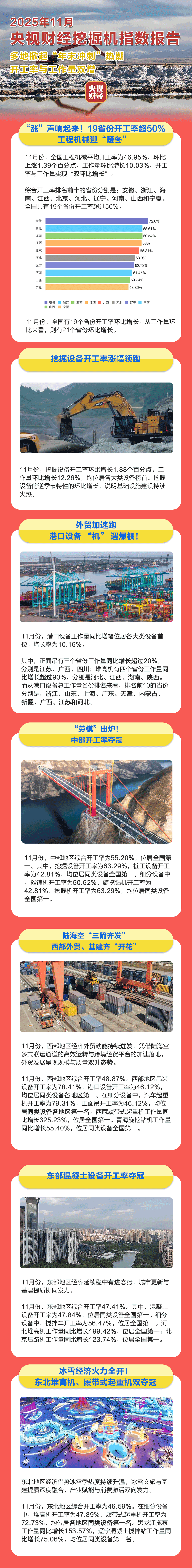 挖掘機是基礎設施建設的“標配”,是反映基礎設施建設、觀察固定資產投資等經濟變化的風向標。央視財經打造的“央視財經挖掘機指數”今天發布了最新相關數據。11月份,雖然受北方冬季施工條件限制,依然擋不住項目建設的火熱勢頭,多地掀起“年末沖刺”熱潮,11月全國工程機械平均開工率與工作量均實現環比增長。