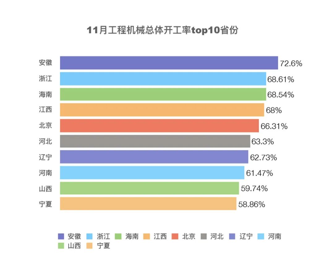 綜合開工率排名前十的省份分別是:安徽、浙江、海南、江西、北京、河北、遼寧、河南、山西和寧夏。全國共有19個省份開工率超過50%。