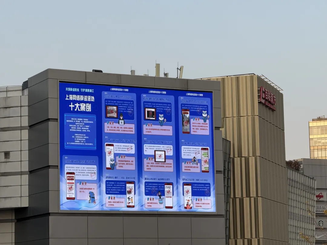 在閔行區(qū)各大核心商圈的戶外大型電子屏和樓宇內(nèi)廣告屏上,設(shè)計精良、標(biāo)語醒目的網(wǎng)絡(luò)辟謠案例海報循環(huán)播放,用直觀有力的視覺語言,將維護(hù)清朗網(wǎng)絡(luò)空間的理念,嵌入市民的日常通勤與休閑購物場景中。