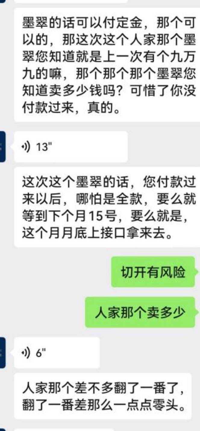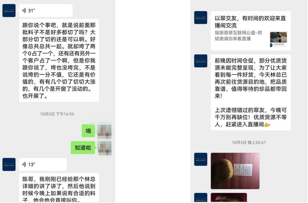 今年國慶假期間,他刷短視頻的時候看到一個翡翠原石直播間的廣告,之后在客服人員邀請下添加好友,接受對方關于翡翠市場的宣傳,并進入直播間觀看、學習。