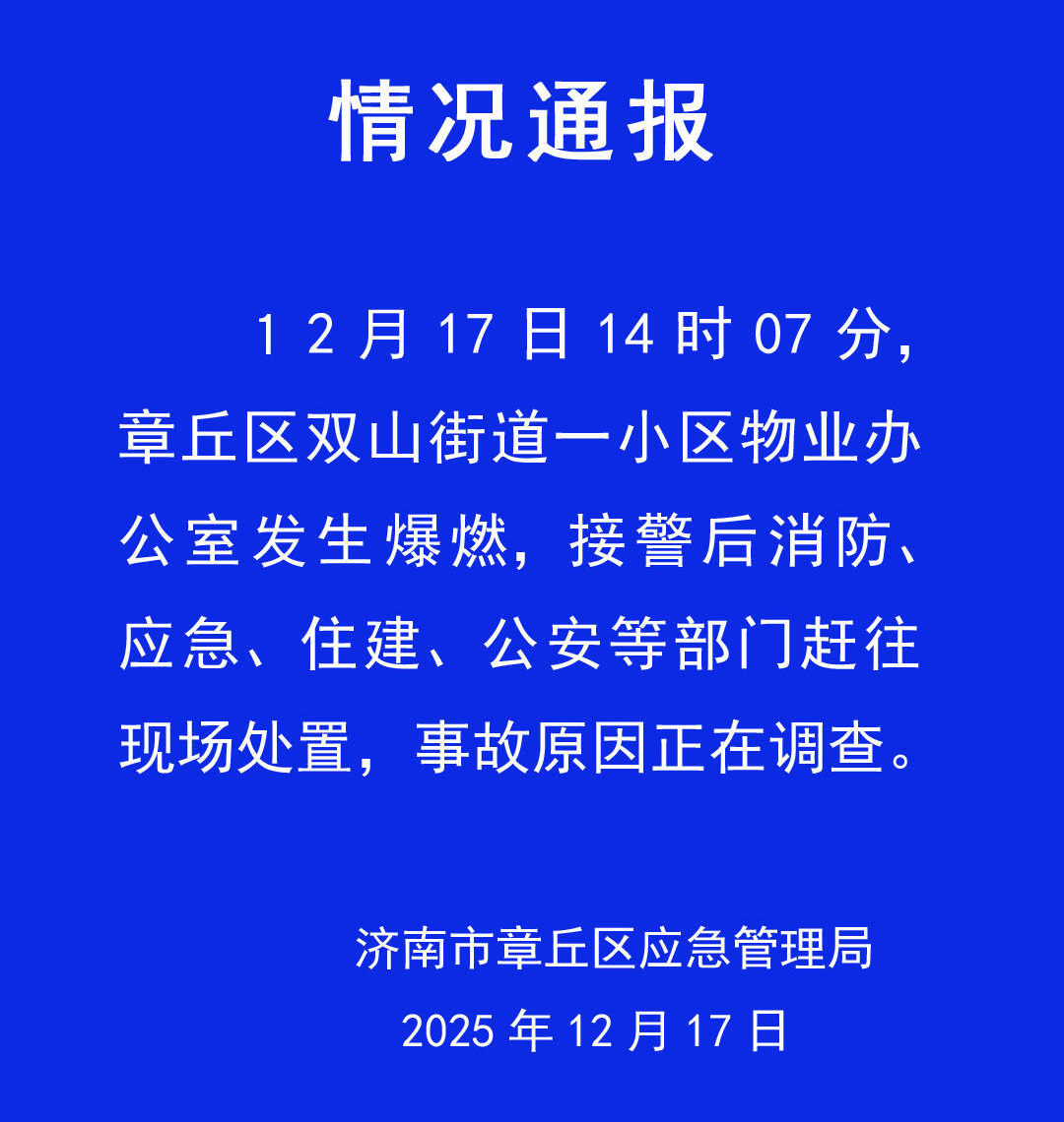 12月17日14時7分,章丘區雙山街道一小區物業辦公室發生爆燃,接警后消防應急、住建、公安等部門趕往現場處置,事故原因正在調查。