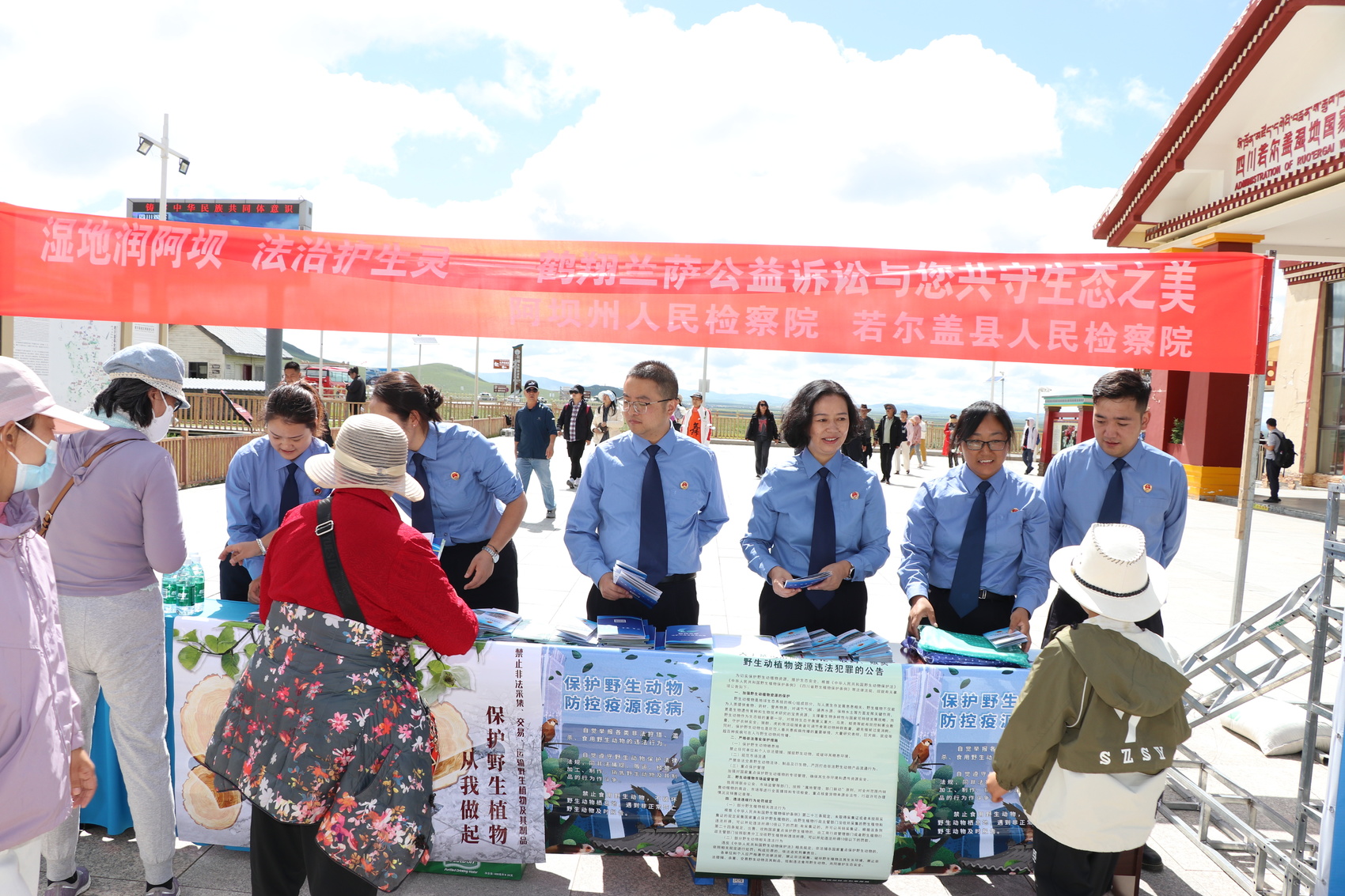 2025年8月15日,阿壩州檢察院“鶴翔蘭薩”公益訴訟團(tuán)隊攜手州法院、州林草局在若爾蓋縣花湖景區(qū)共同開展“守護(hù)藍(lán)天精靈?共筑生態(tài)家園”法治宣傳活動