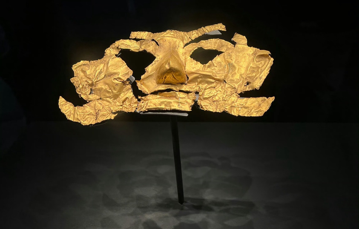 在專家手中,金箔被慢慢展開,真容一點(diǎn)點(diǎn)展現(xiàn),這是半張黃金面具,距今3000年,依然金光燦燦、十分奪目。雖然只有半張,但體量超過同時(shí)期發(fā)現(xiàn)的最大黃金面具。