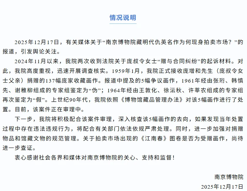 2025年12月17日,有關(guān)媒體關(guān)于“南京博物院藏明代仇英名作為何現(xiàn)身拍賣市場?”的報道,引發(fā)輿論關(guān)注。