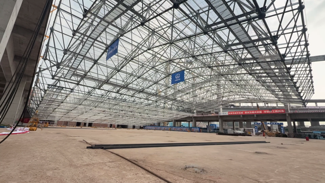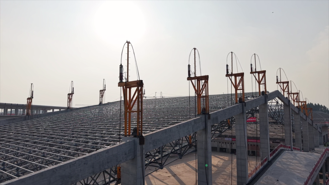 據了解,此次完成提升的屋蓋鋼結構網架是建筑核心亮點,采用混凝土框架+網架組合結構,兼具穩固性與美學性,其中網架長138.2米、寬68.0米,重約600噸,需提升30米。屋蓋鋼結構網架桿件密集、安裝精度要求高,且施工需兼顧兩線共用站房的結構協同性,施工難度較大。