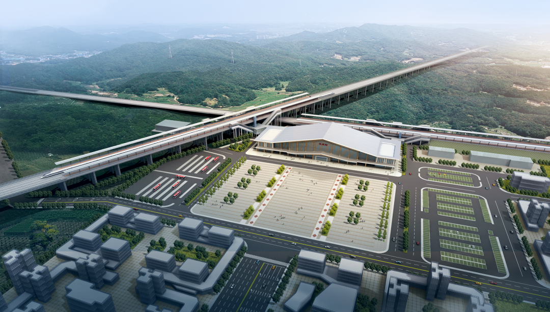 該站是成達萬高鐵與成渝中線高鐵的共用車站,兩條設計時速為350公里的高鐵在這里形成“十”字交叉運輸格局。其中成達萬高鐵站臺為橋式站臺、成渝中線高鐵站臺為路基站臺,分別配套對應雨棚與進出站設施,實現兩線高效換乘。建筑以“鐘靈毓秀 山水樂至”為設計理念,中部坡頂層疊高聳,兩側空間錯落進退并融入綠意景觀,呈現簡潔舒展的新中式風格。