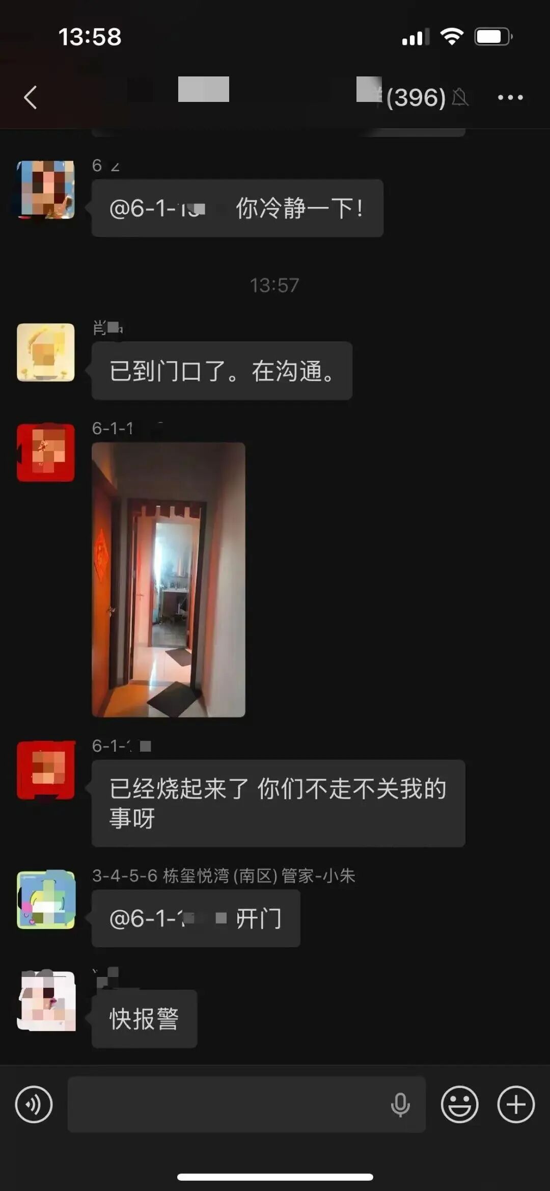 13時57分,該業主稱“已經燒起來了”,有物業工作人員稱已趕到現場。群內有其他業主勸這名業主冷靜。