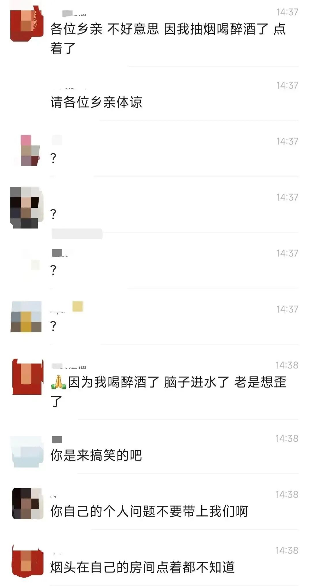 下午14時40分左右,該業主稱“各位鄉親,不好意思,因我抽煙喝醉酒了,點著了”“煙頭在自己房間點著都不知道”。