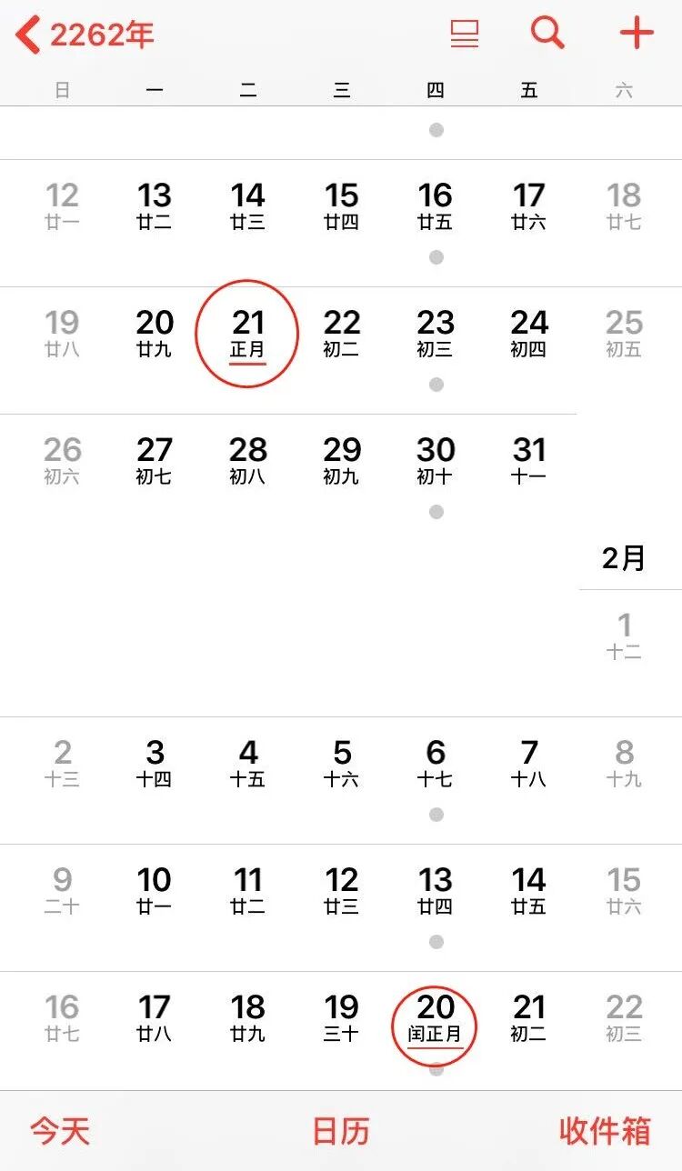根據萬年歷查詢,2262年1月21日是農歷正月初一(第一個春節),2月20日是閏正月初一(第二個春節),這種閏正月現象十分罕見。