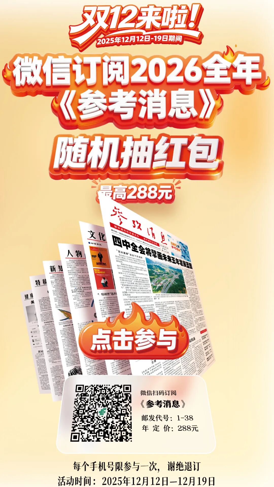 現在訂閱《參考消息》都能享受驚喜福利:12月12日至12月19日,通過微信訂閱2026年《參考消息》,即可參與隨機抽紅包活動,最高可贏288元!