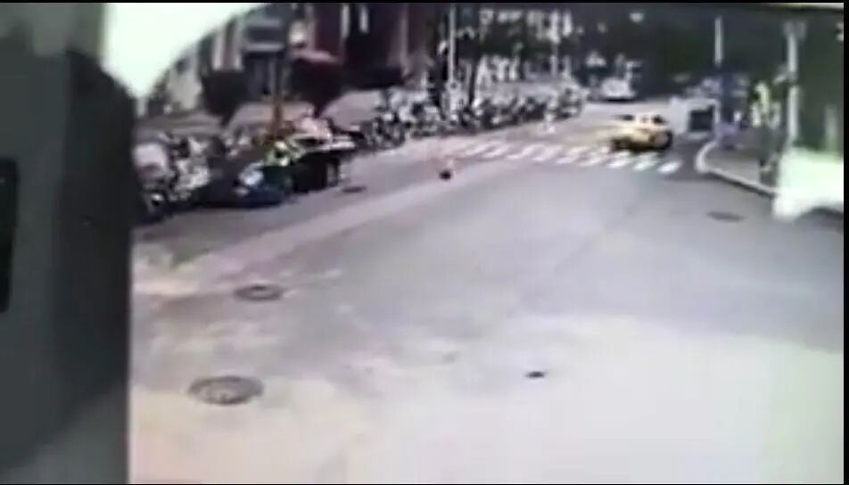 視頻顯示,一輛黑色轎車高速通過一處路口,將多名騎車人員撞倒。(圖據(jù)極目新聞)