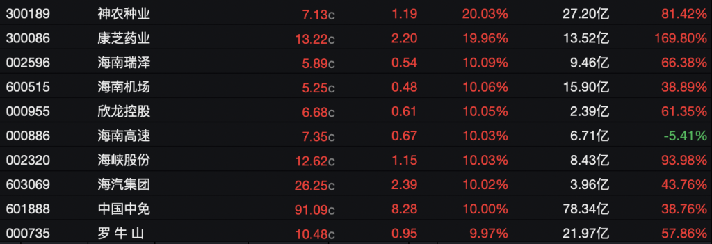 截至12月22日A股收盤,海南自貿(mào)港指數(shù)內(nèi),包括神農(nóng)種業(yè)(300189.SZ)、康芝藥業(yè)(300086.SZ)、海南機(jī)場(chǎng)(600515.SH)、海南高速(000886.SZ)、中國(guó)中免(601888.SH)、凱撒旅業(yè)(000796.SZ)、海航控股(600221.SH)等在內(nèi)的15個(gè)成分股漲停。