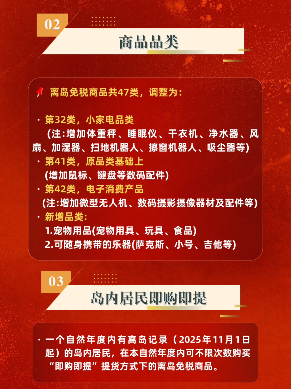 與此同時(shí)一個(gè)自然年度內(nèi)有離島記錄(2025年11月1日起)的島內(nèi)居民,在本自然年度內(nèi)可不限次數(shù)購(gòu)買“即購(gòu)即提”提貨方式下的15類單價(jià)不超過2萬(wàn)元(不含)的免稅商品,年度購(gòu)物額度不超過10萬(wàn)元。