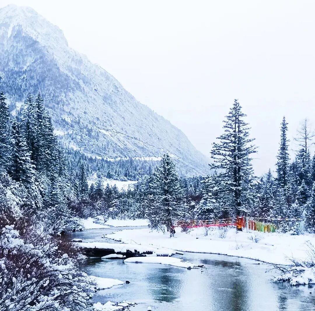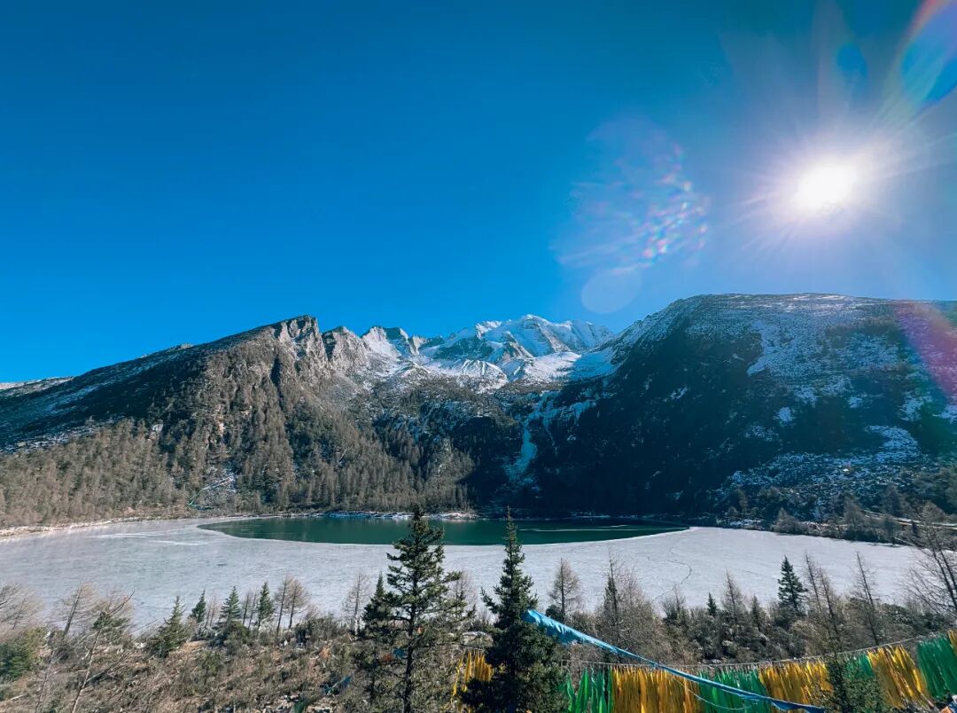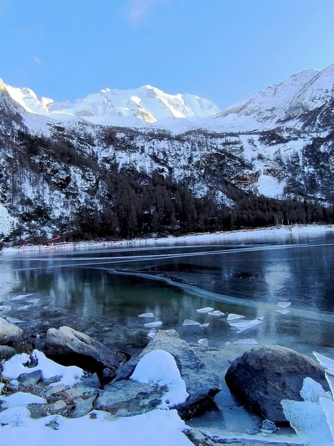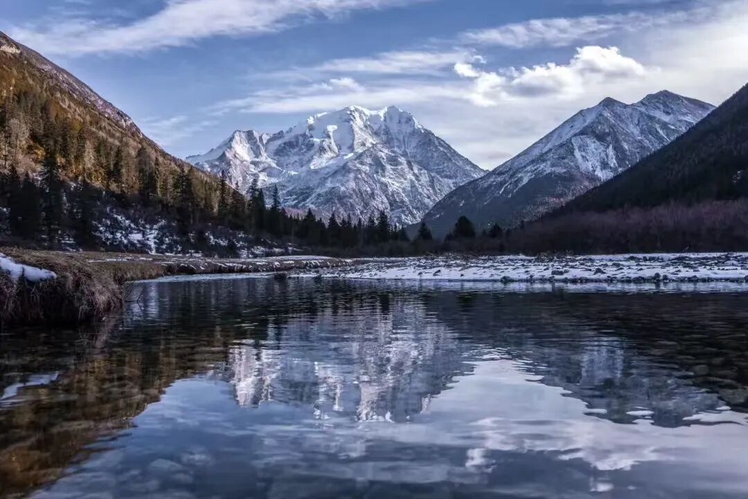 湖面倒映著雪山與周邊的雪花覆蓋的樹林