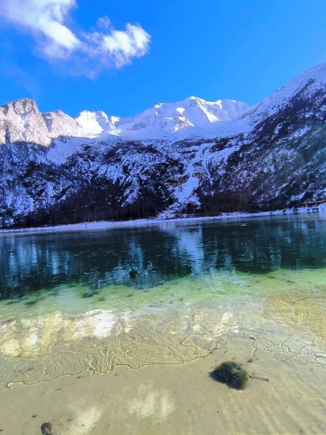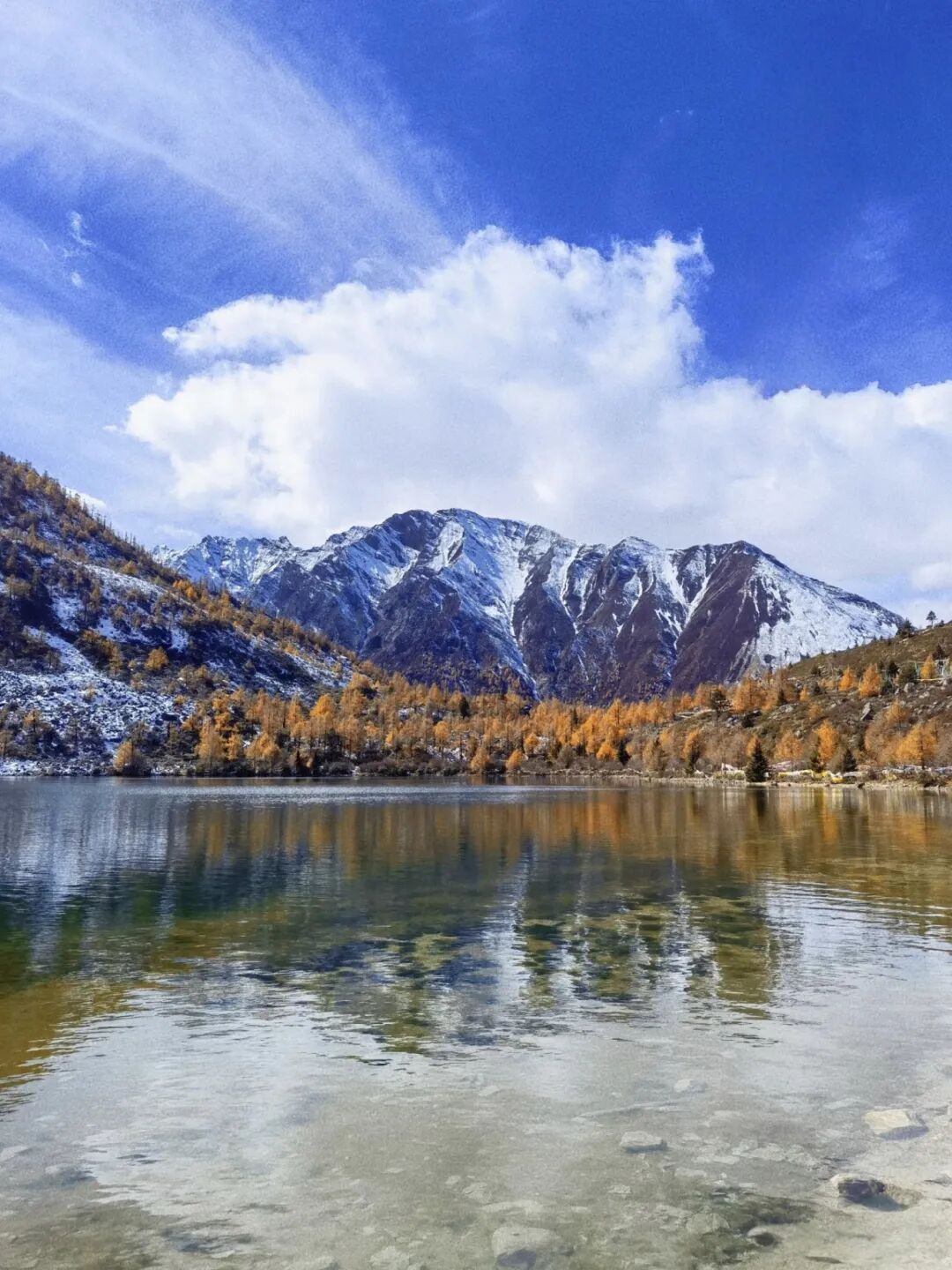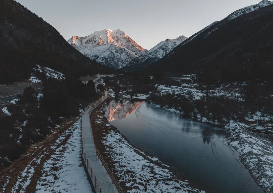 湖面倒映著雪山與周邊的雪花覆蓋的樹林