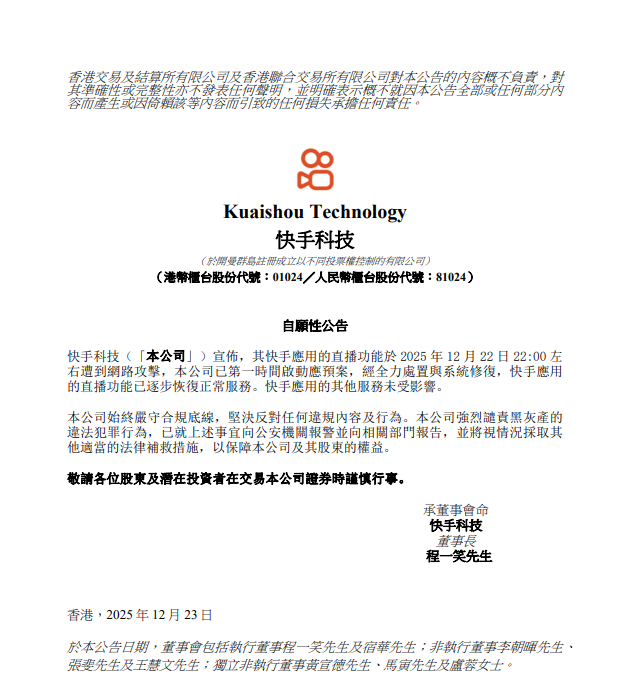 12月23日,快手發布聲明稱,快手應用的直播功能于2025年12月22日22時左右遭到網絡攻擊,本公司已第一時間啟動應急預案,經全力處置與系統修復,快手應用的直播功能已逐步恢復正常服務。快手應用的其他服務未受影響。