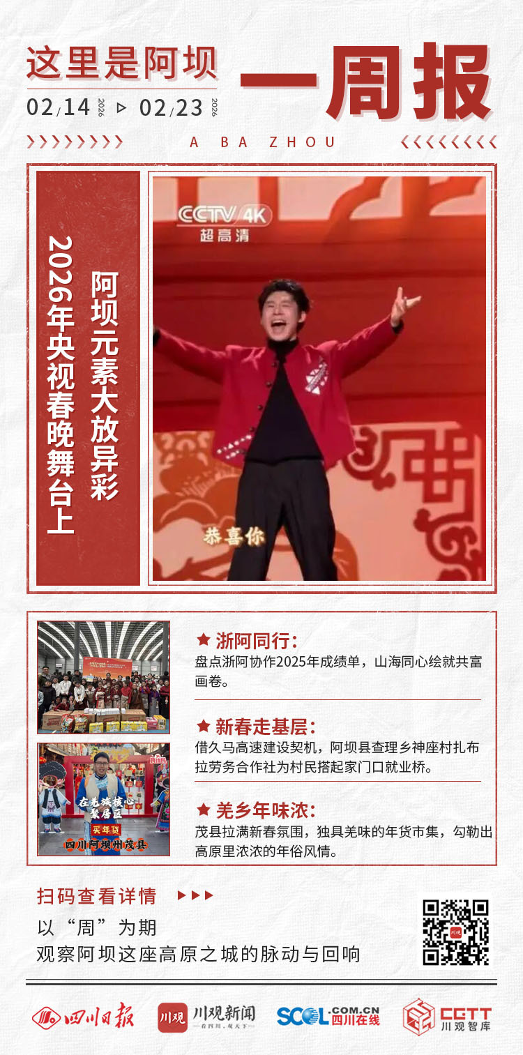 2月14日至2月23日,迎來傳統節日春節。2026年央視春晚舞臺上,阿壩元素大放異彩,茂縣羌族歌手王餅、羌族小朋友瓦依姊亮相不同節目;源自阿壩小金縣的“中砧1號”蘋果也登上春晚,這是從原生于小金縣的蘋果資源中篩選出“小金海棠”,并將其作為親本培育而成的品種,填補我國蘋果矮化自根砧空白,成為西部蘋果優生區的“中國根”。