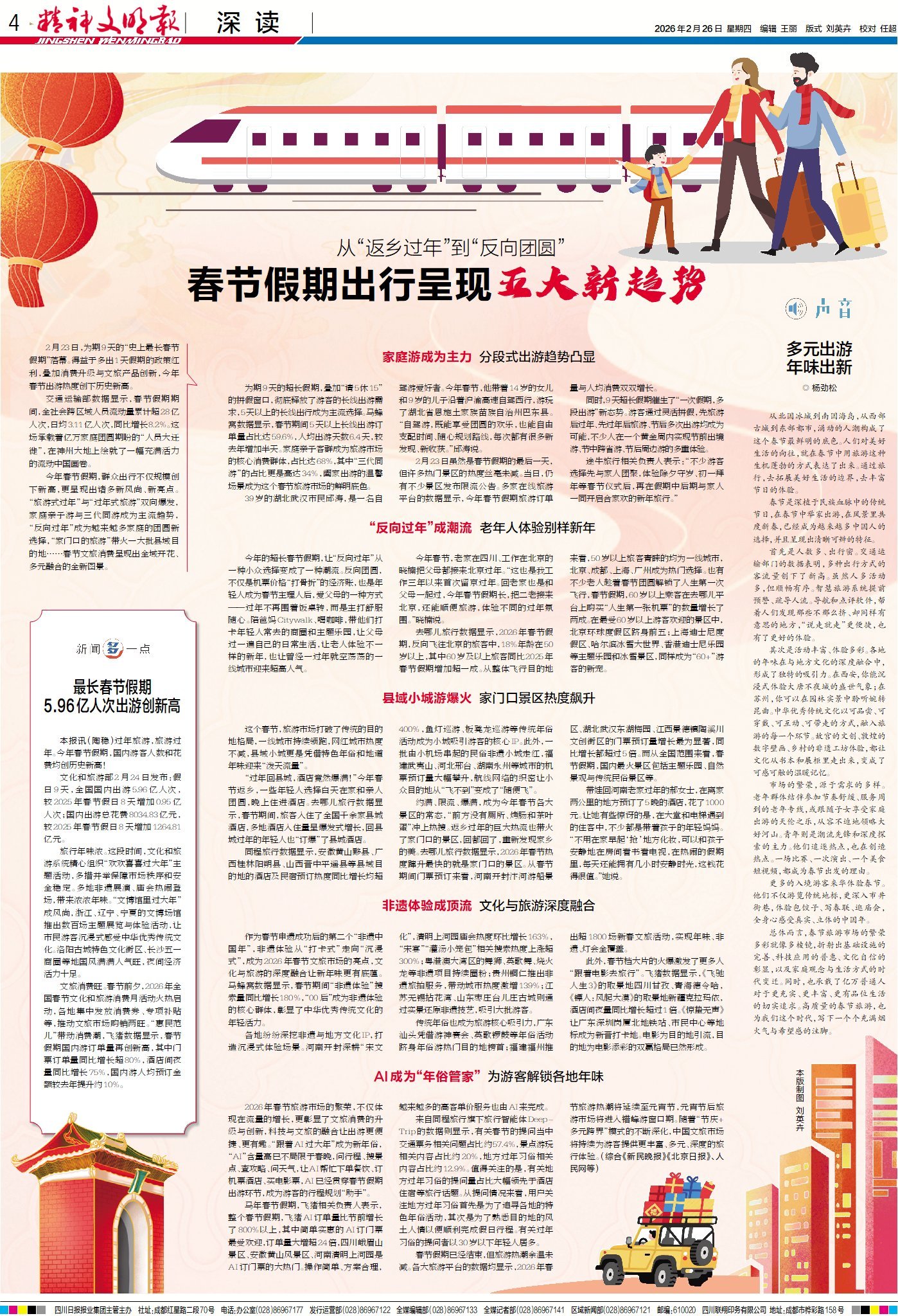 2月23日,為期9天的“史上最長春節假期”落幕。得益于多出1天假期的政策紅利,疊加消費升級與文旅產品創新,今年春節出游熱度創下歷史新高。交通運輸部數據顯示,春節假期期間,全社會跨區域人員流動量累計超28億人次,日均3.11億人次,同比增長8.2%。這場承載著億萬家庭團圓期盼的“人員大遷徙”,在神州大地上繪就了一幅充滿活力的流動中國畫卷。今年春節假期,群眾出行不僅規模創下新高,更呈現出諸多新風尚、新亮點。請關注今日4版“深讀”春節假期出行五大新趨勢。