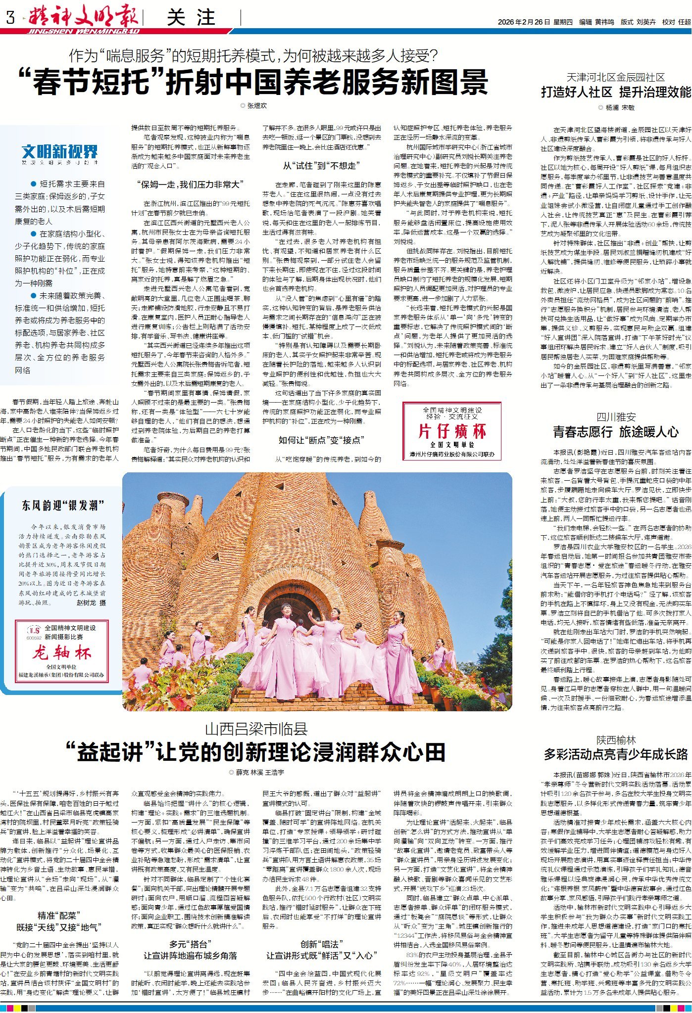 春節假期,當年輕人踏上旅途、奔赴山海,家中高齡老人誰來陪伴?當保姆返鄉過年,需要24小時照護的失能老人如何安頓?在人口老齡化的當下,這些“臨時照護斷點”正在催生一種新的養老選擇。今年春節期間,多地民政部門聯合養老機構推出“春節短托”服務,為有需求的老年人提供數日至數周不等的短期托養服務。來今日3版“關注”《文明新視界》欄目,看“春節短托”折射的中國養老服務新圖景。