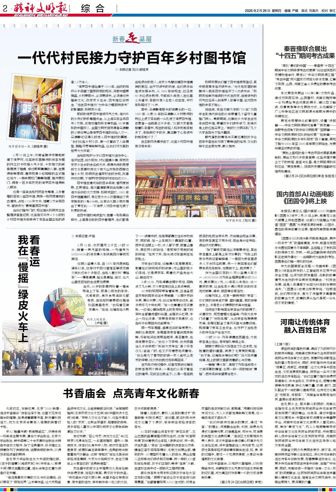 新春伊始,暖意隨行。云南省騰沖綺羅圖書館,百年書香薪火相傳,退休老人義務值守,青年學子接力傳薪,藏著鄉村的文脈與希望;四川省攀枝花公益慢火車,五十余載穿行大山,低價便民、守護煙火,載著老鄉的期盼與團圓。今日2版《新春走基層》欄目聚焦藏在煙火里的溫情與堅守,記錄基層大地上的新春模樣與時代溫度。
