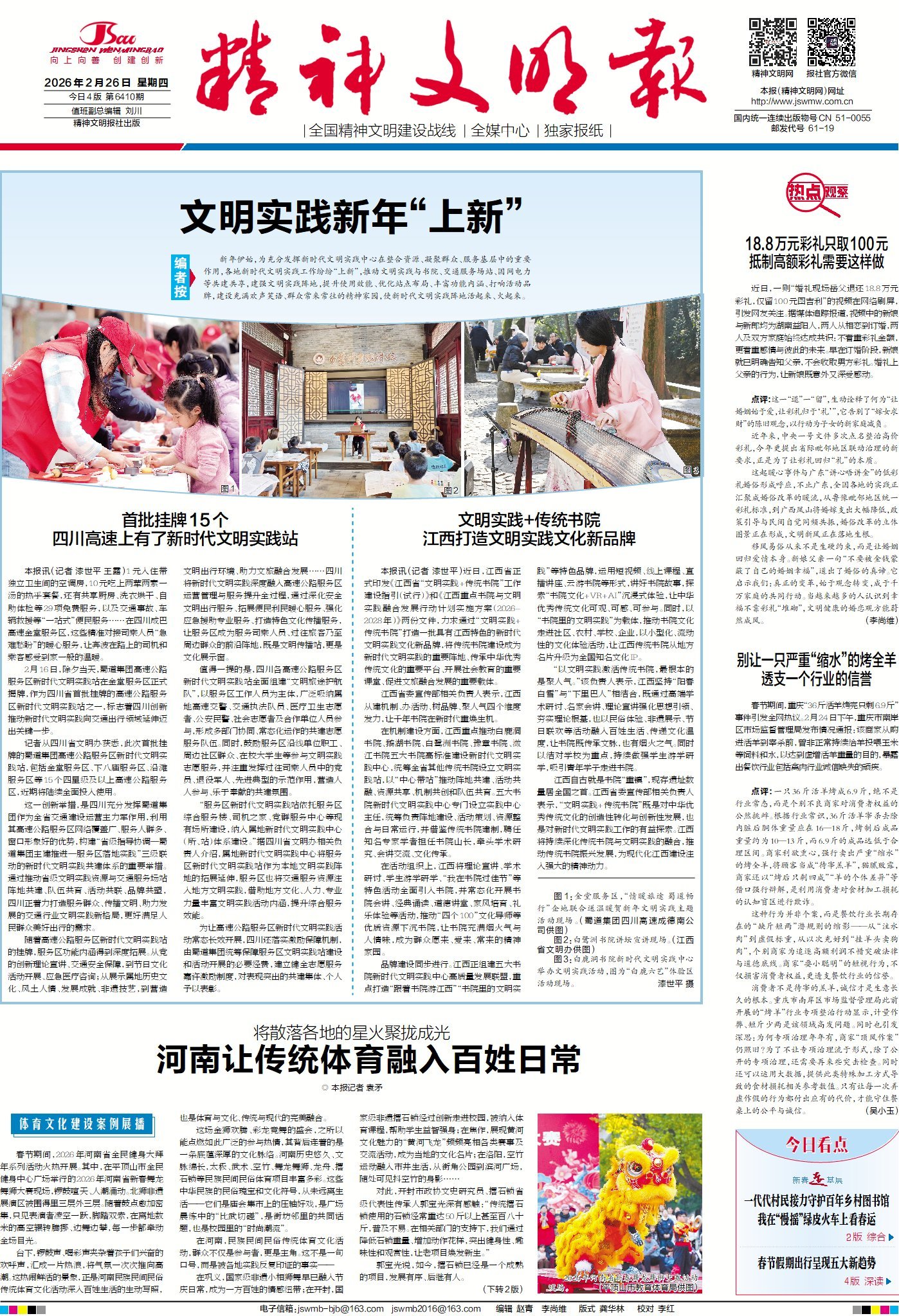 新春伊始,為充分發揮新時代文明實踐中心在整合資源、凝聚群眾、服務基層中的重要作用,各地新時代文明實踐工作紛紛“上新”,推動文明實踐與書院、交通服務場站、國網電力等共建共享,建強文明實踐陣地,提升使用效能、優化站點布局、豐富功能內涵、打響活動品牌,建設充滿歡聲笑語、群眾常來常往的精神家園,使新時代文明實踐陣地活起來、火起來。一起走進今日1版頭條,看看四川和江西兩地文明實踐新年“上新”了啥。