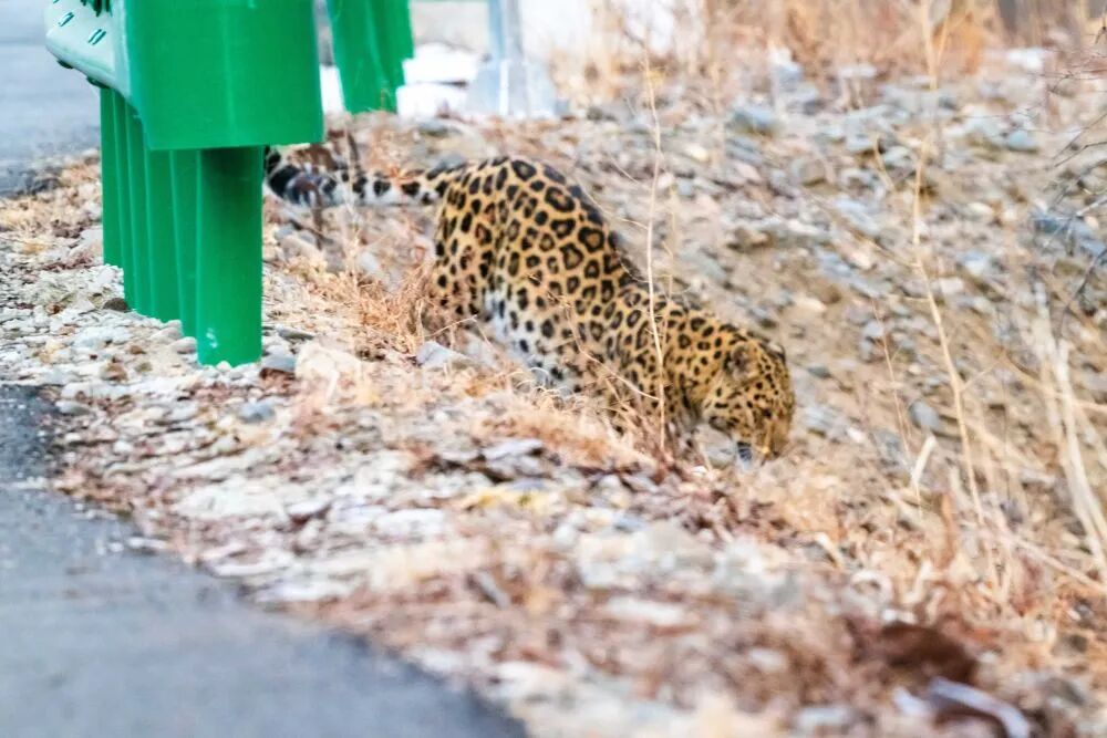 2月23日,吉林攝影師王蒞翔在位于東北虎豹國家公園腹地的吉林省琿春市鎮安嶺村附近公路邂逅一只野生東北豹。據王蒞翔介紹,這只東北豹從公路竄至山林后駐足回望,和他對視了數秒。