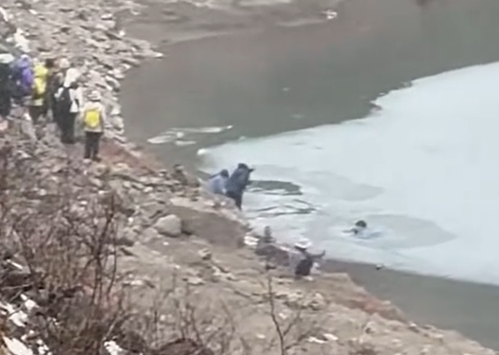 2月25日,有居民發布視頻稱云南雨崩景區冰湖有多人不慎墜入湖中。