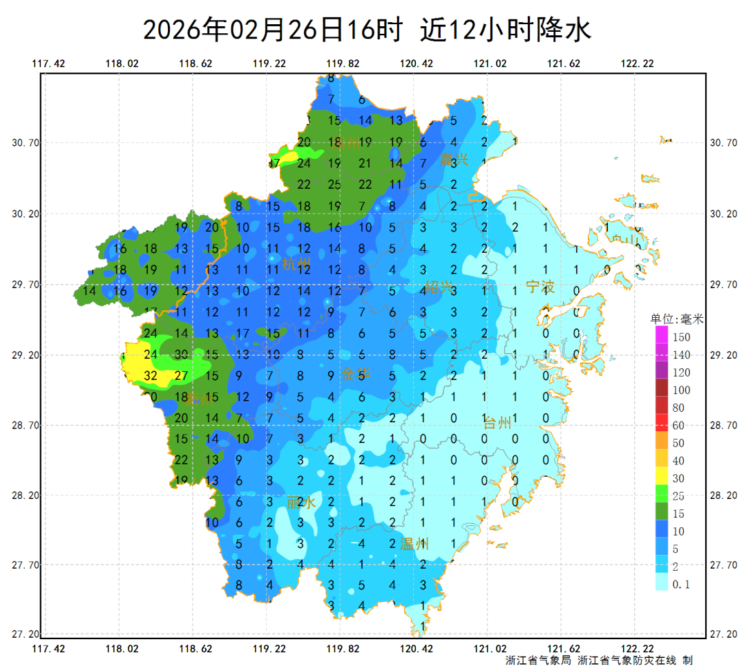 昨天雨水“霸屏”,我省多地“泡湯”,其中開化、安吉、常山達到暴雨量級。26日16時近12小時累計雨量最大在開化縣號嶺村達到44毫米。