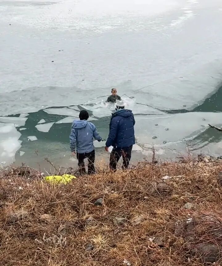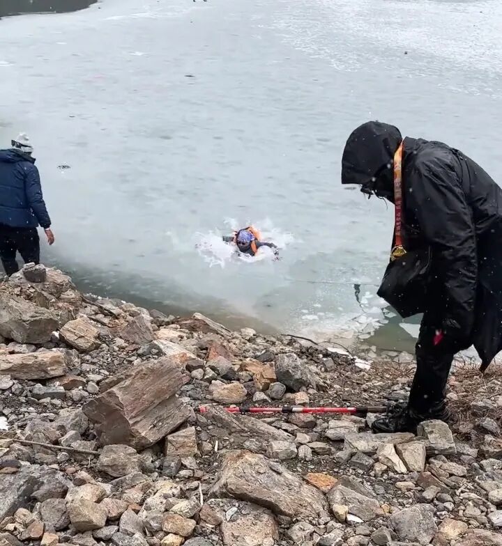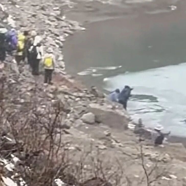 現場視頻顯示,冰湖內有巨大的冰塊,游客們走上冰塊后欲返回岸邊,但邊緣的冰塊較薄,至少有4人先后踩破冰塊落入湖中。好在此處的湖水看上去不太深,加上岸邊有人幫忙,落水者紛紛上岸。